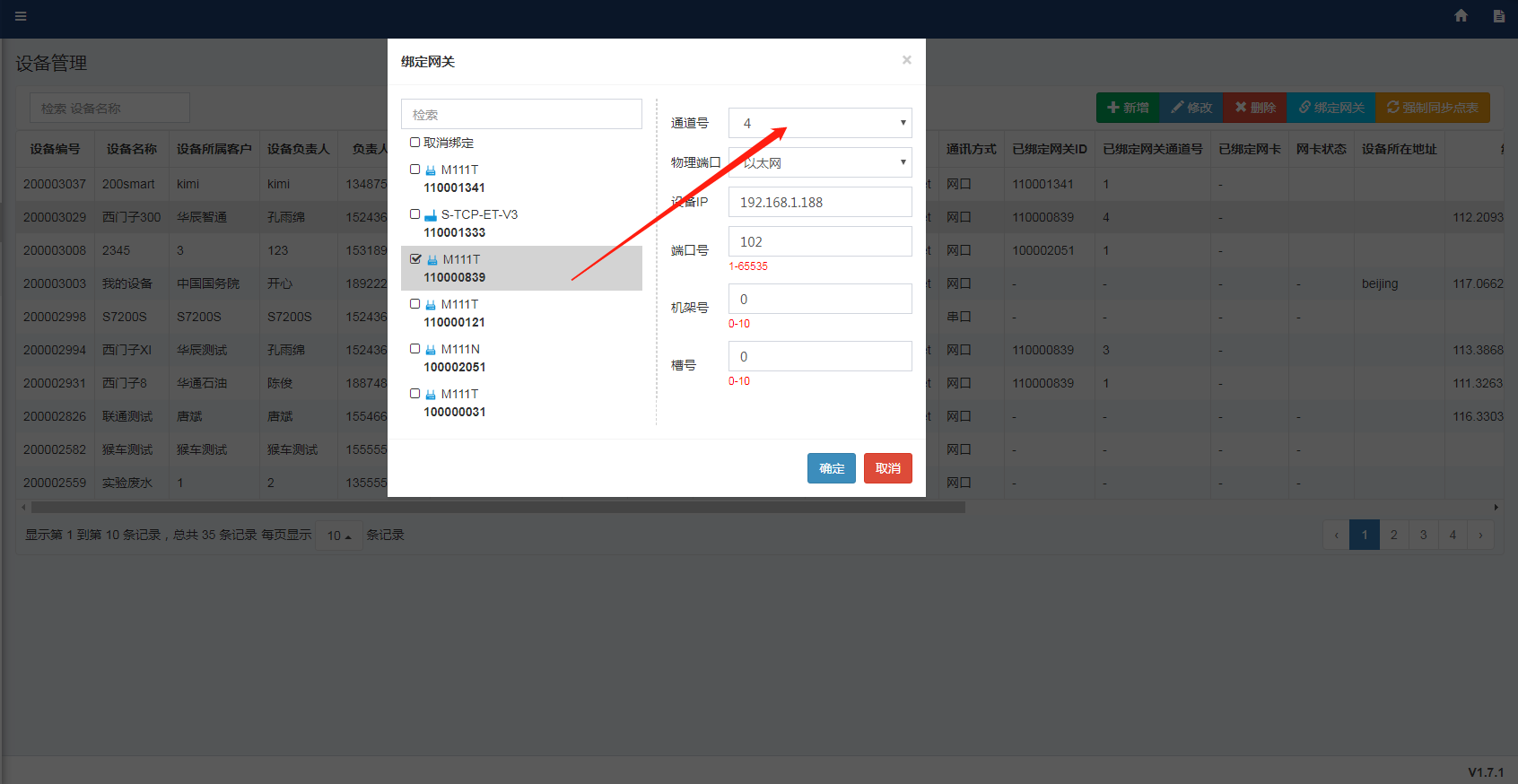 2. 后台通道与平台上所选通道不一致,网关后台“工控数据 - 通道管理”打开的是通道1,思普云平台设备管理处,设备绑定网关时通道选择1。