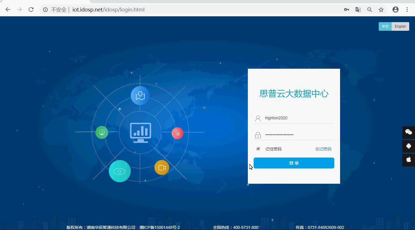 浏览器输入iot.idosp.net 进入思普云登录界面,输入账号密码进入平台管理界面。